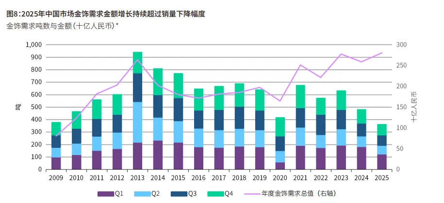 我国金饰消费金额持续增长,销量逐步下降。因为金价不断升高。