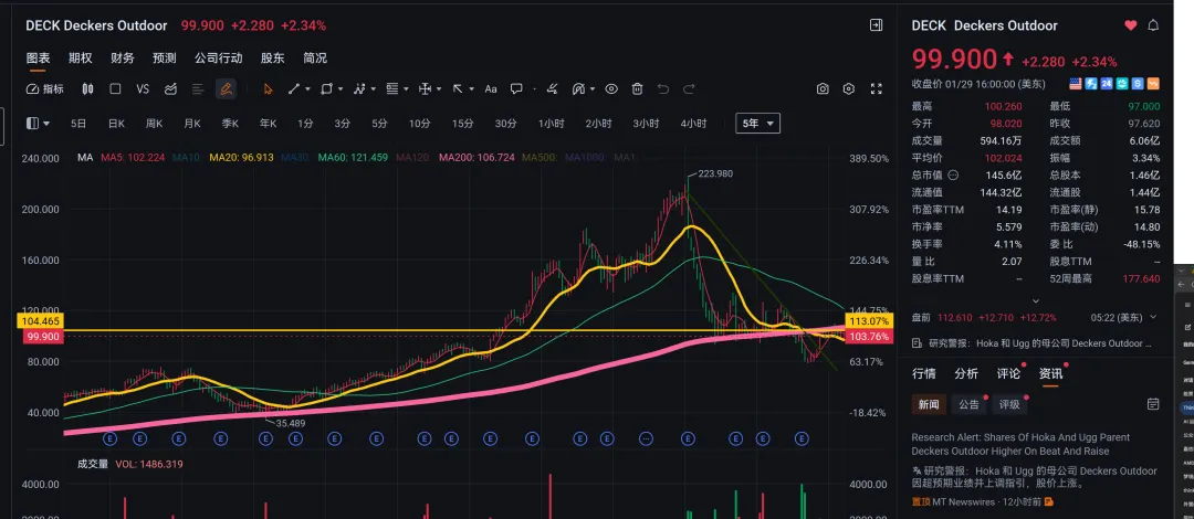 deck 昨天财报,夜盘大概涨13%,也不算白写文章,现在的价格大概在112.61