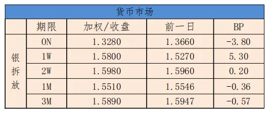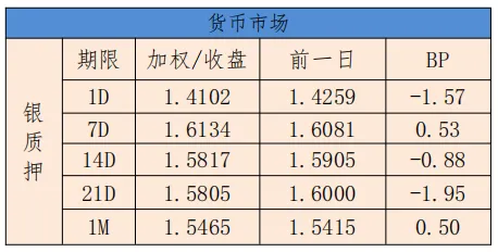 今日银行间市场主要回购利率整体下行。隔夜加权平均利率收盘于1.4102%,上日的收盘价为1.4259%,下行1.57BP;14天收盘价为1.5817%,相比较昨天的收盘价格1.5905%,下行0.88BP。