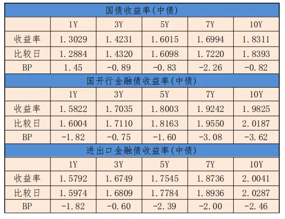 国债5年期带动曲线对应期限下行0.83BP,至1.6015%;7年期带动曲线对应期限下行2.26BP,至1.6994%。