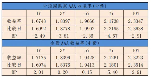 中债中短期票据收益率曲线(AAA)1年期收益率下行2.49BP,至1.6743%,3年期收益率下行3.81BP,至1.8397%。