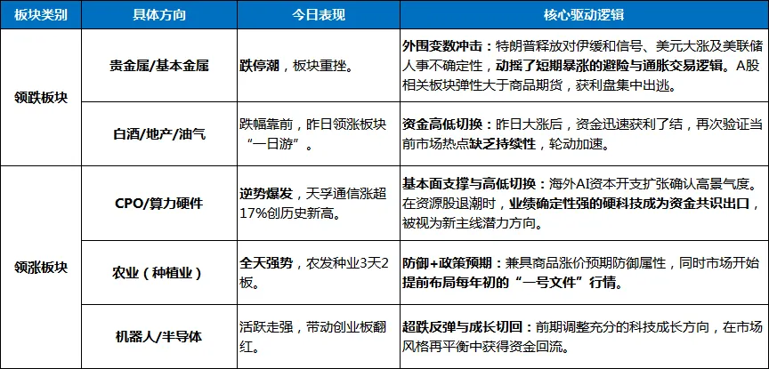 2.结构性流入:在市场深跌后,聪明资金开始逆向布局。主力净流入方向指向CPO、半导体、农业等板块。这并非增量资金入场,而是场内存量资金进行的一次大规模的“弃高就低”式调仓。从追逐短期暴涨的资源股,转向有产业趋势和业绩支撑的科技股,以及有政策预期的防御板块。