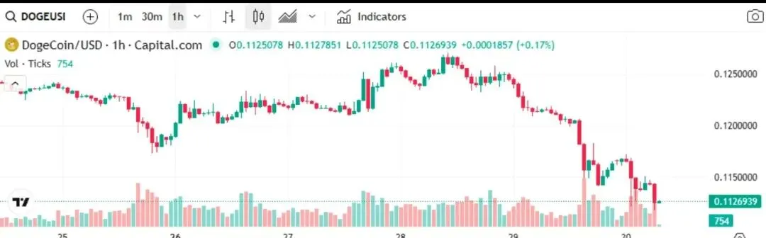 周三,狗狗币价格一度上探 0.127 美元,但在获利盘集中兑现的影响下,行情快速回落。截至发稿时,狗狗币最新成交价为 0.112 美元,24 小时跌幅达 7.28%。从技术结构来看,无论是小时级别、日线还是周线周期,价格均处于下行通道之中,趋势偏空。
