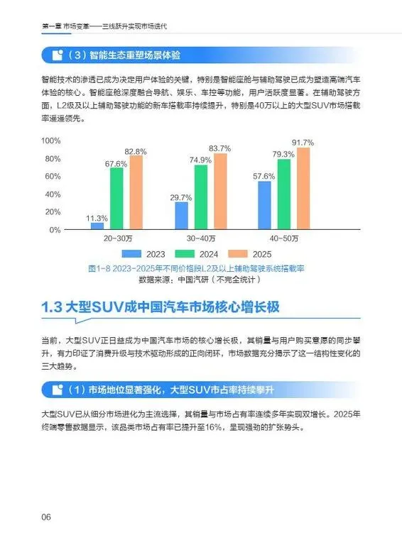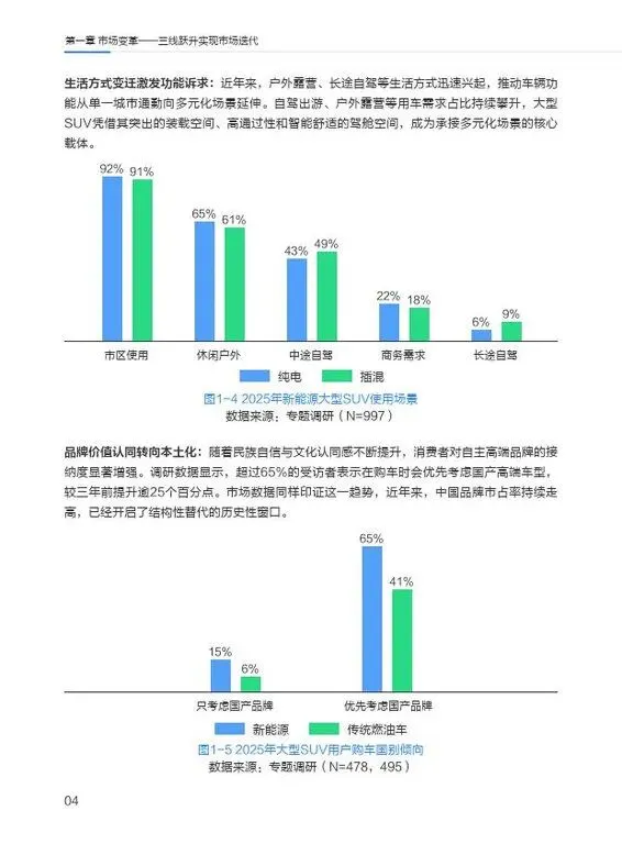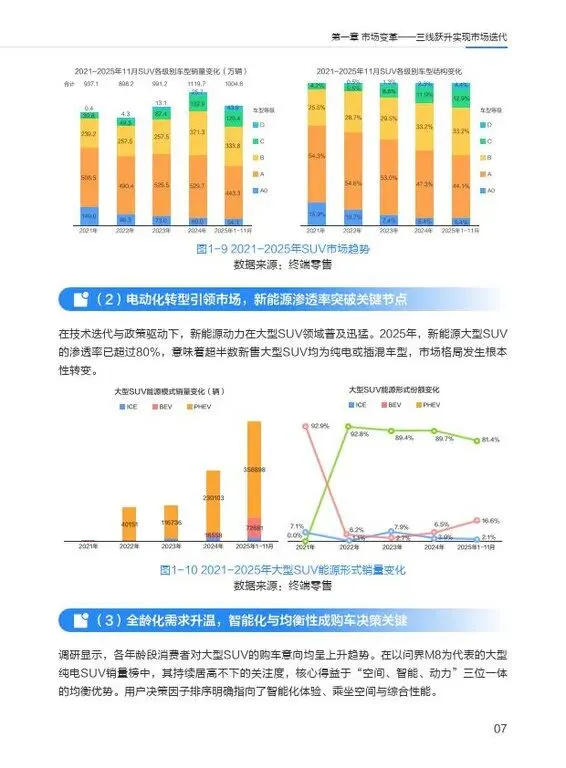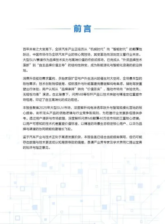本报告聚焦2025年大型SUV市场,深度解析纯电渗透率跃升与智驾规模化落地的核心趋势,剖析龙头产品的领跑逻辑与行业竞争新规则,为把握行业发展脉络提供参考。透过用户调研与市场数据,深度解析问界M8颠覆40万级市场的三重核心逻辑:以用户可感知的技术代差重塑价值标准、以精准的场景生态锁定核心用户、以华为品牌与渠道的协同赋能构建增长飞轮。