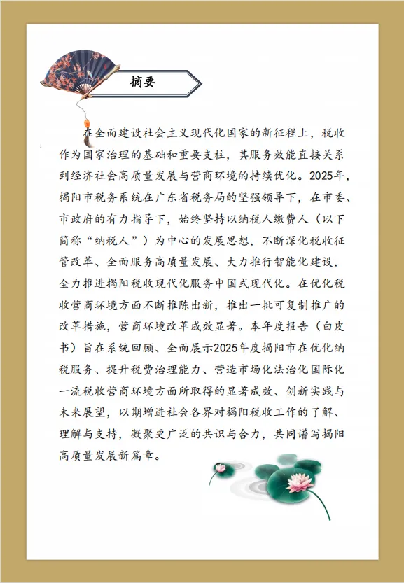 2025年,揭阳市税务系统在省税务局的坚强领导下,在市委、市政府的有力指导下,始终坚持以纳税人缴费人为中心的发展思想,不断深化税收征管改革、全面服务高质量发展、大力推行智能化建设,全力推进揭阳税收现代化服务中国式现代化。在优化税收营商环境方面不断推陈出新,推出一批可复制推广的改革措施,营商环境改革成效显著。本年度报告系统回顾、全面展示了2025年度揭阳市在优化纳税服务、提升税费治理能力、营造市场化法治化国际化一流税收营商环境方面所取得的显著成效、创新实践与未来展望,以期增进社会各界对揭阳税收工作的了解、理解与支持,凝聚更广泛的共识与合力,共同谱写揭阳高质量发展新篇章。