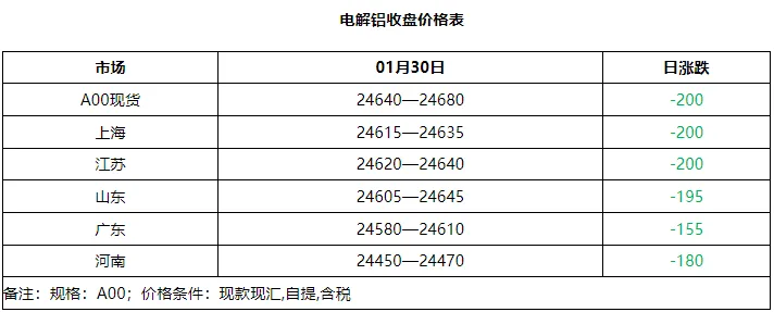 今日电解铝市场重心震荡下挫,国内现货铝市场主流成交价格在24450-24645元/吨之间。期盘宽幅回撤,现货灵活走弱。沪铝上午盘面低开后继续深度回撤。主力跌760元/吨至24730元/吨,近月跌730元/吨至24660元/吨。华东地区对2月贴水210元/吨,华南地区对2月贴水275元/吨。