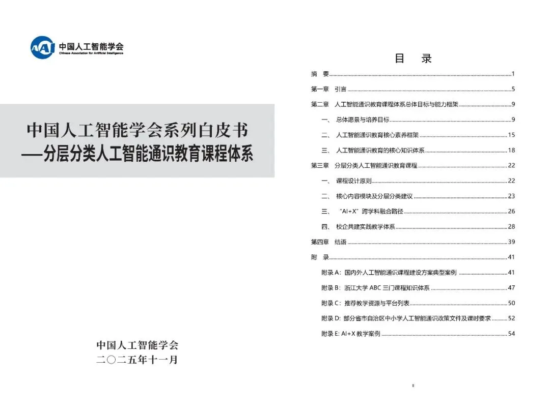 2025中国人工智能大会暨全国人工智能学院院长(系主任)年会上重磅发布了CAAI系列白皮书——《分层分类人工智能通识教育课程体系》。本次课程体系白皮书由中国人工智能学会组织,国家教材建设重点研究基地(高等学校人工智能教材研究)、中国人工智能学会教育工作委员会、浙江大学人工智能教育教学研究中心共同参与编写。