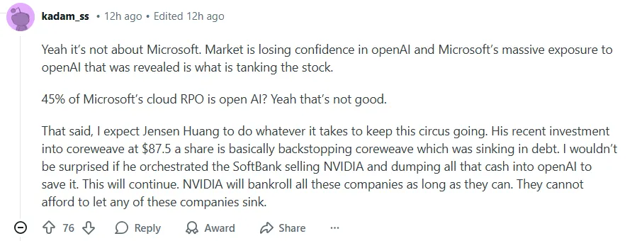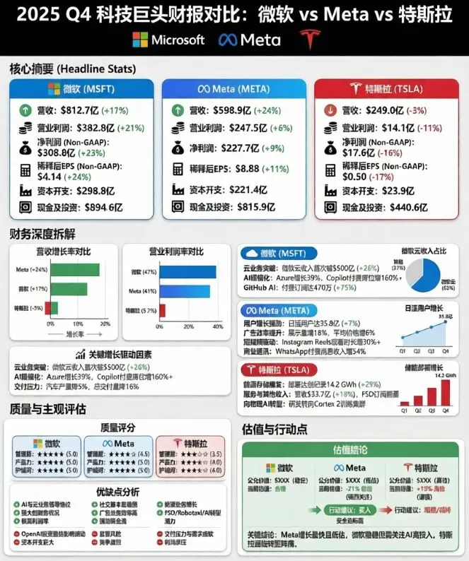 最近,Microsoft、Meta、Tesla 陆续发布最新季度财报,市场反应可谓冰火两重天。我从社交平台热议中提炼出关键信息,一图看懂三大巨头的“得与失”。? Microsoft:云增长略缓,AI投入引争议业绩表现:营收 $81.3B(超预期 $80.3B),EPS $4.14(超预期 $3.97)。关注焦点:Azure 云增速约 39%,未达 40% 预期;资本支出高达 $37.5B,预计还将大幅攀升。❌ 负面:投资者担心高 Capex 成“烧钱机”,Copilot 普及慢于预期,股价盘后跌 6–11%。✅ 正面:长期看好者认为基本面稳健(收入同比增 17%、云优势显著),视回调为买入机会。业绩表现:营收 $59.9B(超预期 $58.4B),EPS $8.88(超预期 $8.18);DAU 达 35.8 亿(+7% YoY)。关注焦点:广告收入同比增 24%,展示量 +18%、单价 +9%;2026 年 Capex 指引升至 $115–135B,全力押注 AI 基础设施。✅ 强烈看涨:股价涨 9–10%,用户称 Capex 是“聪明赌注”,看好 AI/超智能未来。⚠️ 少量担忧:Capex 压力或对利润率构成挑战,Q4 广告投放曾现技术问题。业绩表现:营收约 $25–30B(同比 -3%),EPS 降 32%;库存 $14B,能源存储业务增长亮眼。关注焦点:AI/数据中心投入激增,毛利率接近 20%(好于预期 16%);交付量 49.7 万 vs 产量 44.7 万。❌ 偏负面:利润暴跌 46%,被批“AI 钱炉”;股价波动剧烈(虽有 4% 涨幅但整体承压)。✅ 乐观派:认为 FSD 与机器人业务具长期爆发潜力,低 COGS 与强现金流支撑估值修复。三家公司财报共同折射出一个趋势——AI 相关资本开支成市场焦点。它既是未来增长的引擎,也伴随回报滞后的风险。短期波动往往放大失望情绪,而 Meta 本轮明显赢得更多信心票。? 投资启示:在 AI 浪潮里,辨识“烧钱”与“播种”的区别,或许正是穿越噪音的关键。