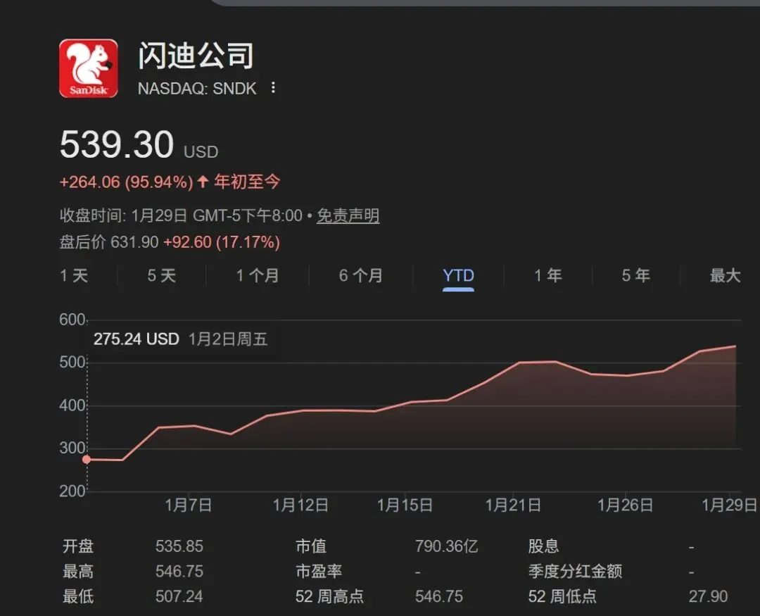 1月29日,美国存储技术公司闪迪(SanDisk)公布最新财报,利润与收入均实现大幅跃升,远超市场预期。股价也随之剧烈波动,盘后价一度拉升超17%,收盘报价539.3美元,年初至今已上涨95.94%。