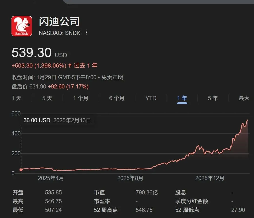 2025年2月,闪迪从西部数据分拆并独立上市,之后股价一路疯涨。首发股价36美元,过去11个月内已累计上涨近1400%。今年1月初,伯恩斯坦分析师马克·纽曼将闪迪列为年度首选之一。