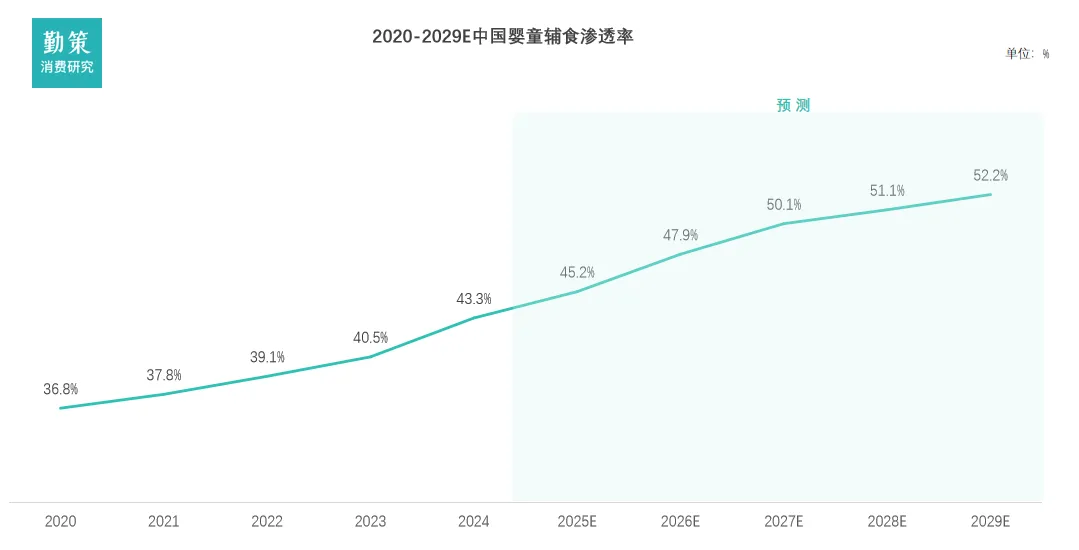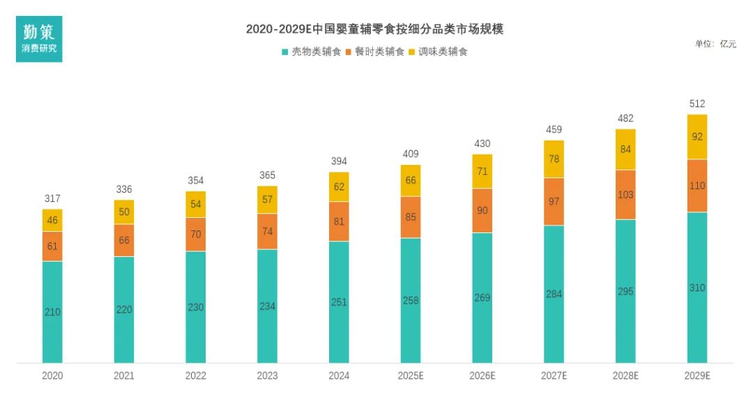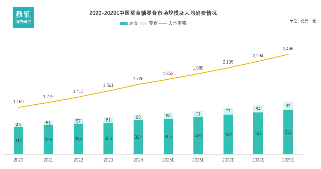 婴童零辅食指专为6个月至6周岁婴童设计的食品,旨在用于提供营养、辅助生长,及用于补充能量和营养,符合易消化、避开致敏成分等安全共识,同时有助于婴童口腔发育及手部动作训练。辅食作为母乳或配方奶粉之外的补充,用于提供全面营养,可进一步分为三大类,即谷物类辅食、餐食类辅食及调味类辅食。2、 政策刺激难抵人口内生动力走弱过去十六年,中国常住人口新生人数经历了“冲高后持续探底,近期低位小幅反弹”的剧烈波动。数据清晰地显示,出生人数在“单独二孩”(2014年)和“全面二孩”(2016年)政策刺激下形成两个高峰,其中2014年达1,987万人的峰值。然而,政策堆积效应消退后,出生人口自2018年起连续六年快速下滑,于2023年触及902万人的历史低点,累计降幅超过40%。2024年虽小幅回升至954万人,但绝对数量仍处于历史低位区间。数据来源:企业招股书,弗若斯特沙利文,勤策消费研究随着家长对零辅食在营养补充、咀嚼训练等方面专业价值的认知不断加深,该类产品已从婴童成长过程中的“可选补充品”逐渐转变为“必需品”。同时,喂养过程中多产品搭配使用的频率增加,能够同时满足多重营养及发育需求,进一步推动了市场渗透率的提升。6个月至6周岁婴童的零辅食渗透率已从2020年的36.8%上升至2024年的43.3%,预计未来将继续保持稳步增长趋势,到2029年有望达到约52.2%。数据来源:企业招股书,弗若斯特沙利文,勤策消费研究在公众号等新媒体平台和母婴内容创作者的推动下,行业已完成初步市场培育,正进入加速增长通道。中国婴童零辅食市场整体规模从2020年的362亿元增长至2024年的459亿元,年复合增长率约6.1%。人均年零辅食支出从2020年的1,159元增长至2024年的1,725元,预计2029年将达2,466元。其增长主要源于使用场景从家庭喂养向出行、户外等多场景延伸,以及市场教育深化推动家长对高附加值产品的认可。同时,20-30岁年轻家长因生活节奏快、家庭结构小型化,对即食解决方案依赖度提高,进一步拉动了购买频次和消费意愿,为市场高端化与扩容奠定了需求基础。数据来源:企业招股书,弗若斯特沙利文,勤策消费研究在婴童辅食市场中,谷物类、餐食类和调味类辅食呈现不同发展态势。谷物类辅食作为稳定增长的核心品类,市场规模从2020年210亿元增至2024年251亿元,其作为日常营养基础的地位持续稳固。餐食类和调味类辅食则快速增长,2020-2024年市场规模分别从61亿元、46亿元增至81亿元、62亿元,复合年增长率分别约7.3%和8.1%。受益于饮食精细化、营养认知提升及产品创新,预计到2029年两者规模将分别达到约110亿元和92亿元,2024-2029年复合年增长率预计约为6.3%和8.0%,反映行业向专业化、功能化发展的趋势。二、中国婴童辅零食产业链:从“基础保障”走向“科学精细”上游为农副产品原料、营养强化剂及设备包装材料供应商;下游为销售渠道,品牌方通过下游渠道触达消费者并销售产品。三、中国婴童辅零食竞争格局:市场格局分散,头部企业增长动能分化1.中国婴童零辅食市场格局分散,头部企业增长动能分化