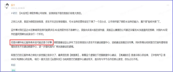 不过早上我们也在圈子分析了,虽然微软大跌,但这件事对我们这边影响不大,因为A股的AI现在是两条叙事逻辑,建设和应用同步进行的。