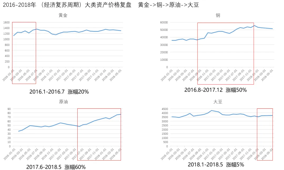 目前我们正处于新一轮经济周期。各类资产表现如下:黄金已经大幅上涨,铜也在上升趋势中,原油刚有上涨的苗头,农产品之中玉米有筑底上升的苗头。