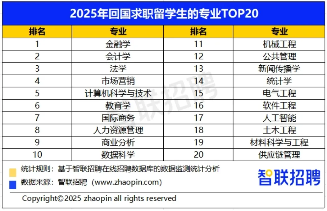 数据显示,2025年回国求职留学生的专业分布中,金融学、会计学、法学等传统商科及社科专业位居前列。同时,与新一代信息技术、高端装备等新质生产力核心领域紧密相关的专业人才供给充足,计算机科学与技术、数据科学、机械工程、电气工程、软件工程、人工智能、材料科学与工程等专业均进入TOP20榜单。