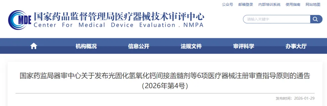 为进一步规范光固化氢氧化钙间接盖髓剂等医疗器械的管理,国家药监局器审中心组织制修订了《光固化氢氧化钙盖髓剂注册审查指导原则》等6项医疗器械注册审查指导原则(见附件),现予发布。