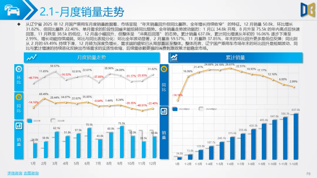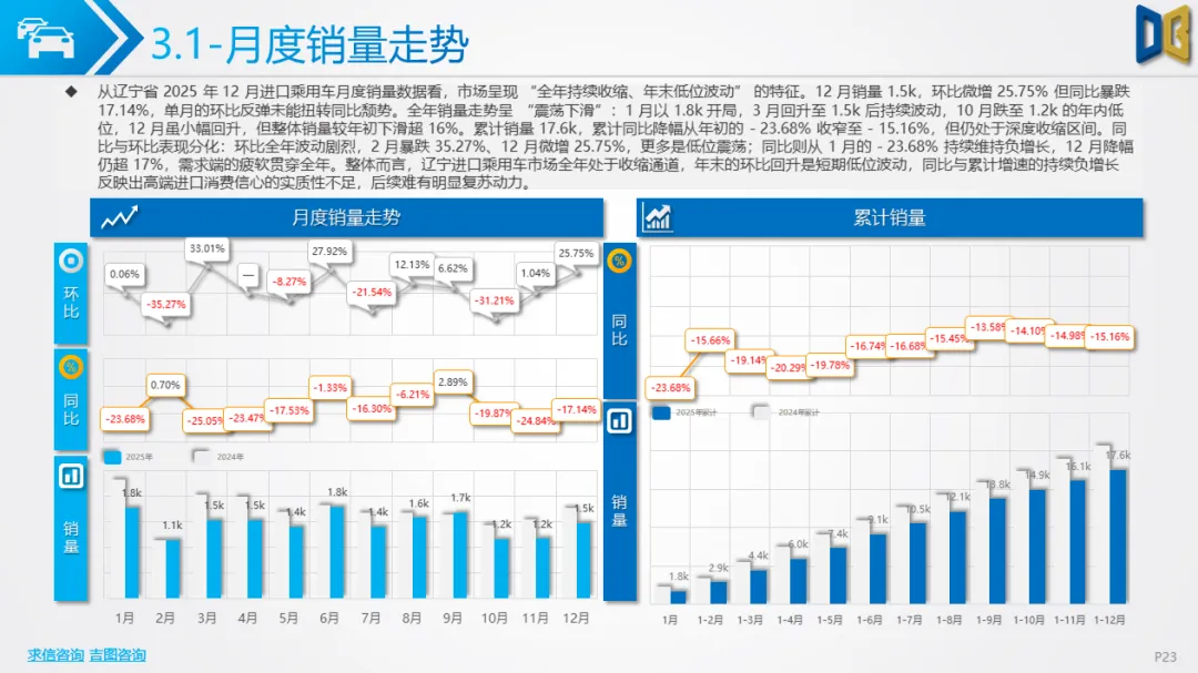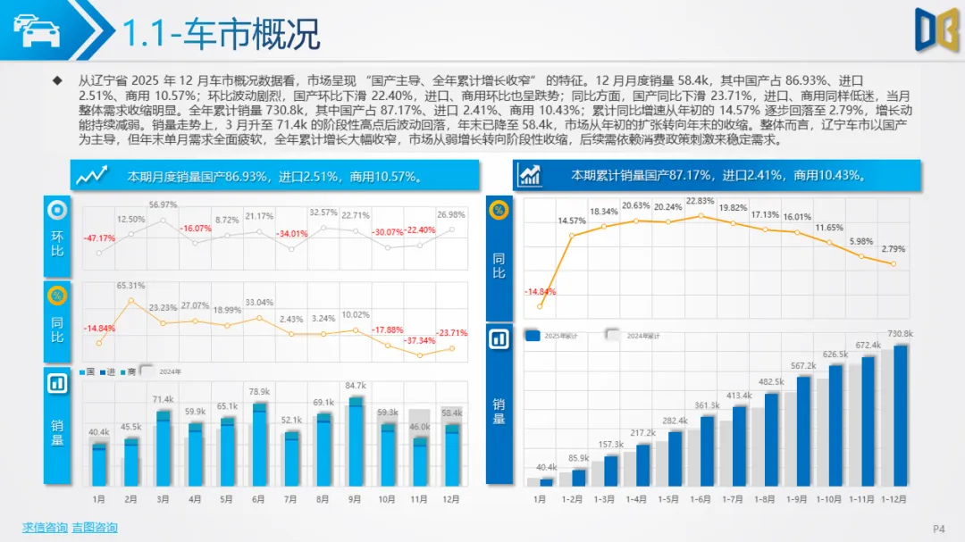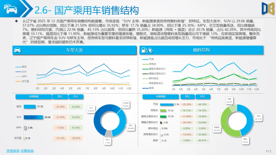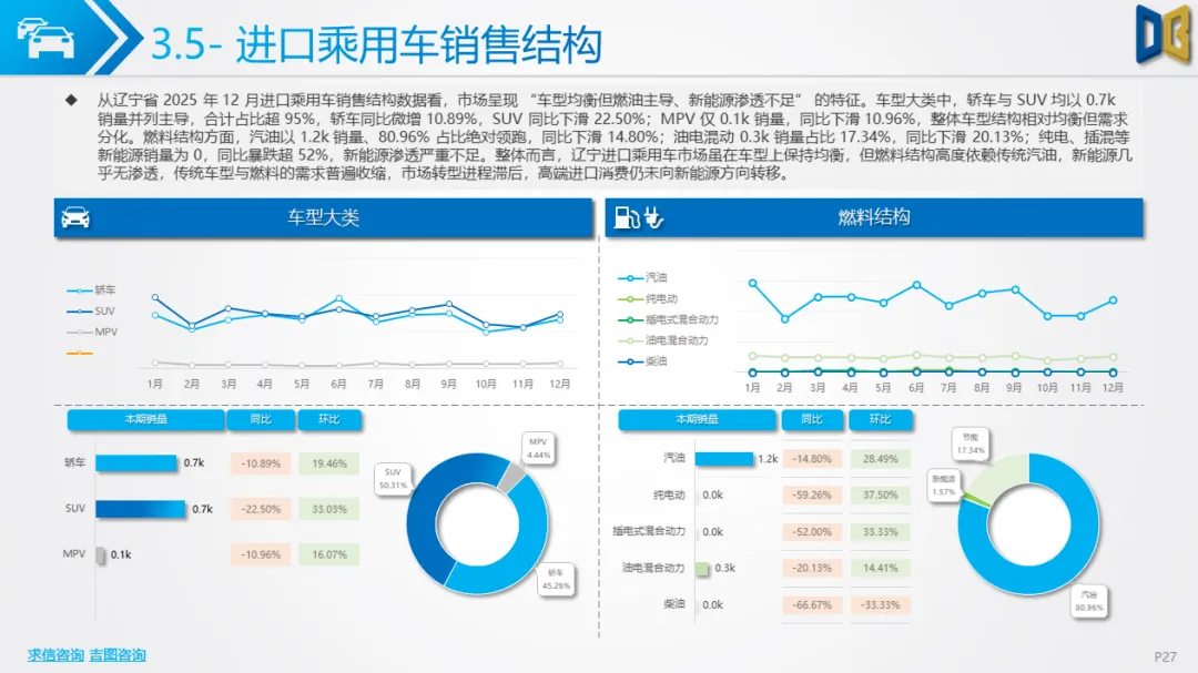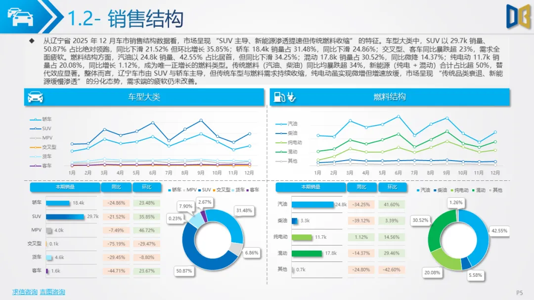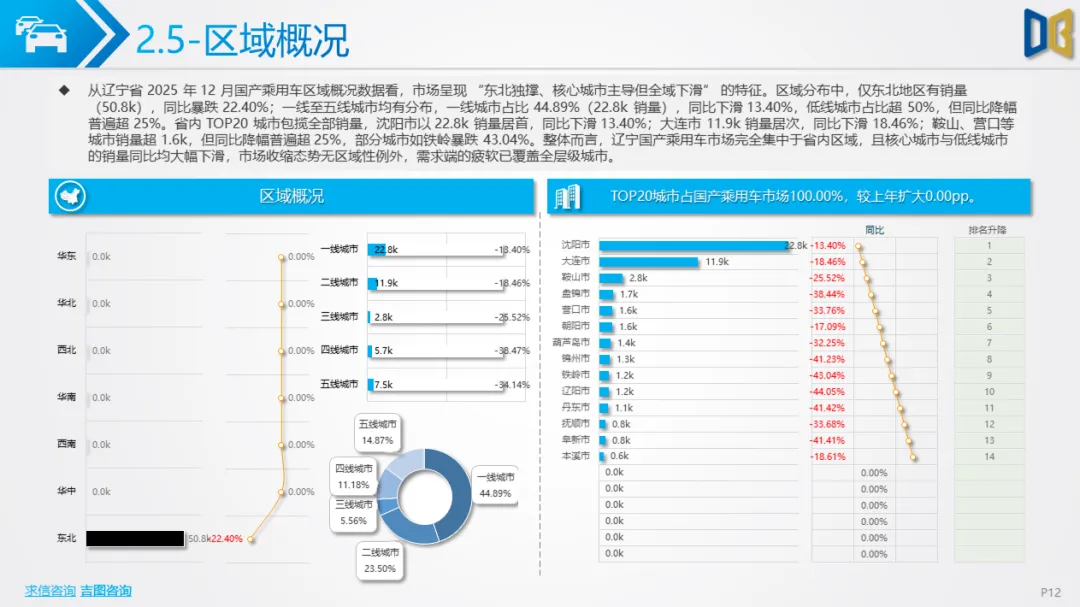 区域集中度极高,核心城市支撑作用减弱:沈阳、大连等核心城市贡献了超80%的进口乘用车与超45%的商用车销量,但核心城市的销量同比也出现下滑,区域市场的 “马太效应” 加剧,但核心城市的支撑能力已显不足。综上,2025 年 12 月辽宁省汽车市场处于 “整体收缩、结构调整、转型滞后” 的阶段,传统燃油车型的颓势与新能源的增长乏力形成矛盾,未来市场的复苏需依赖消费政策的拉动与新能源转型的加速,同时需关注高端与小众品类的增长潜力。
