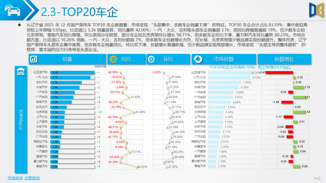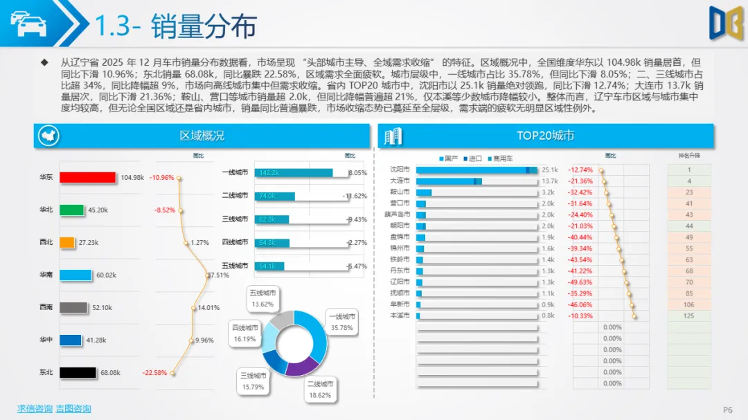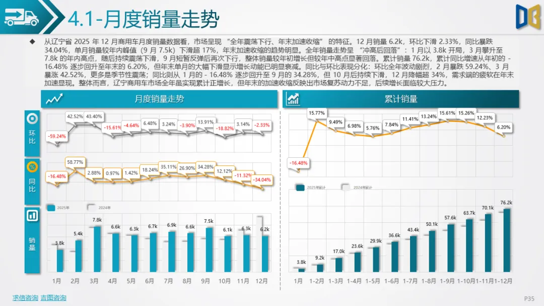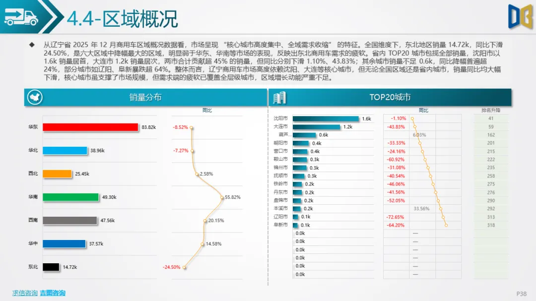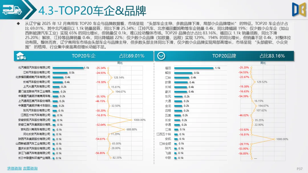 3. 区域与企业:头部集中但增长动能不足商用车市场TOP20车企合计占比69.01%,北汽福田、江铃汽车等头部车企销量居前,但同比降幅超25%;仅少数小众车企(如山西新能源汽车工业)实现65%的同比增长,但销量仅0.1k。区域层面,沈阳、大连两市贡献超45%的销量,但同比分别下滑1.10%、43.83%;其余城市销量不足0.6k,同比降幅超24%,部分城市如阜新暴跌64.20%,全域需求收缩的特征明显。