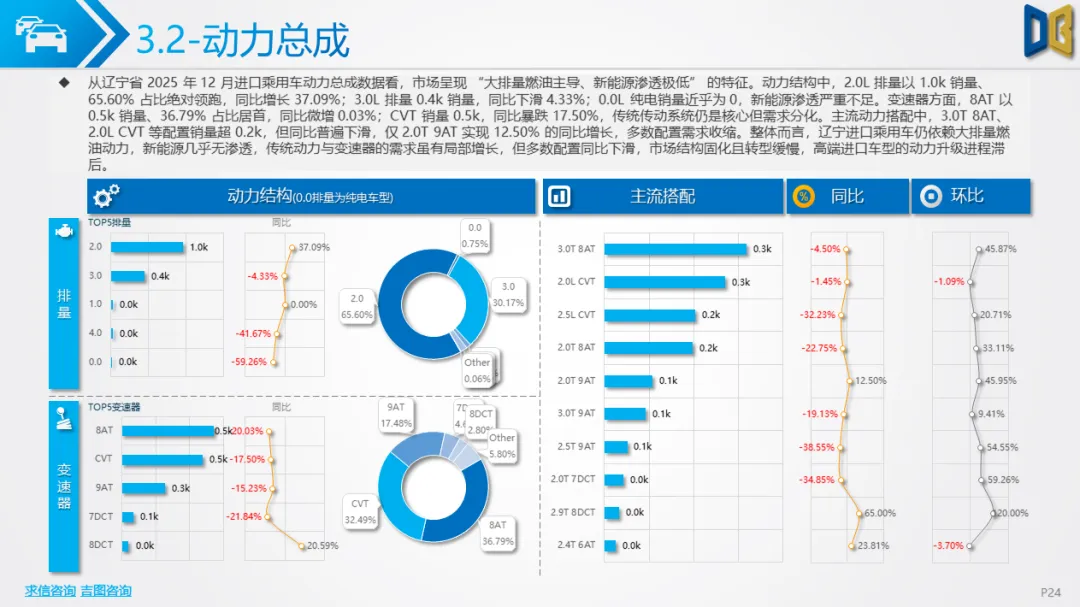 结构分化显著,高端与小众品类突围:在整体收缩的背景下,乘用车C级以上高端车型、商用车微型货车等小众品类实现局部增长,消费向 “高端化” 与 “小众化” 两端集中的趋势显现,但难以拉动整体市场。新能源转型滞后,传统动力仍占主导:辽宁省汽车市场的新能源渗透远低于全国水平,国产乘用车新能源占比不足 3%,进口乘用车近乎为零,商用车纯电占比25%但增长放缓,传统燃油动力仍是市场绝对主力,转型进程滞后。