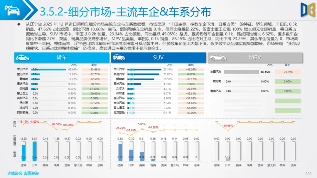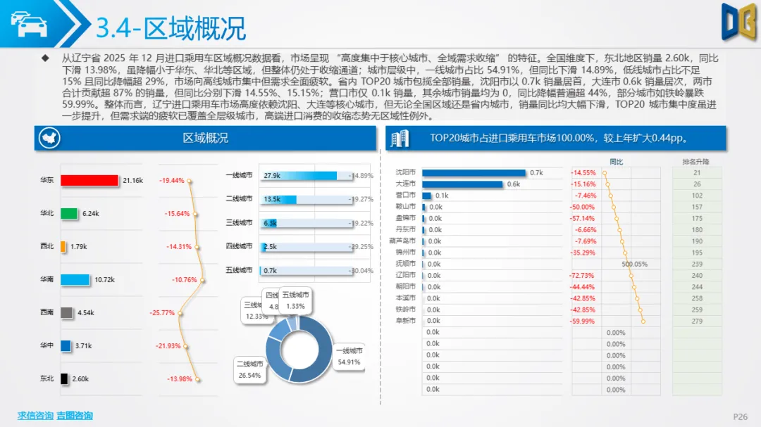 2. 进口乘用车:德日主导但全面收缩,新能源近乎空白进口乘用车市场高度依赖德日品牌,丰田、奔驰、宝马等头部品牌合计占比超85%,但多数品牌同比大幅下滑:丰田销量0.5k,同比暴跌27.66%;奔驰销量0.2k,同比下滑32.92%,仅路虎等少数品牌实现6.62%的同比增长。区域集中度极高但需求收缩:沈阳、大连两市贡献超87%的进口乘用车销量,但同比分别下滑14.55%、15.15%,其余城市销量为0,同比降幅超44%,核心城市的支撑作用难以掩盖全域需求的疲软。