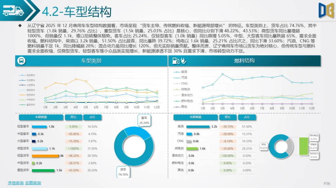 货车主导但全面下滑,新能源增长乏力商用车市场以货车为绝对核心(占比74.76%),但12月各细分车型均出现显著收缩,仅少数小众品类有局部增长。