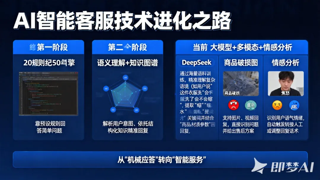 AI智能客服的发展,其实就是技术一直在努力提升“理解用户”的能力。从20世纪50年代的“规则引擎”(靠着预设的规则来回应简单的问题),到中间阶段的“语义理解+知识图谱”(能够分析用户的意图,依靠结构化的知识精准回复),再到现在的“大模型+多模态+情感分析”阶段, 每一步都在于解决“更懂用户”这个核心问题。