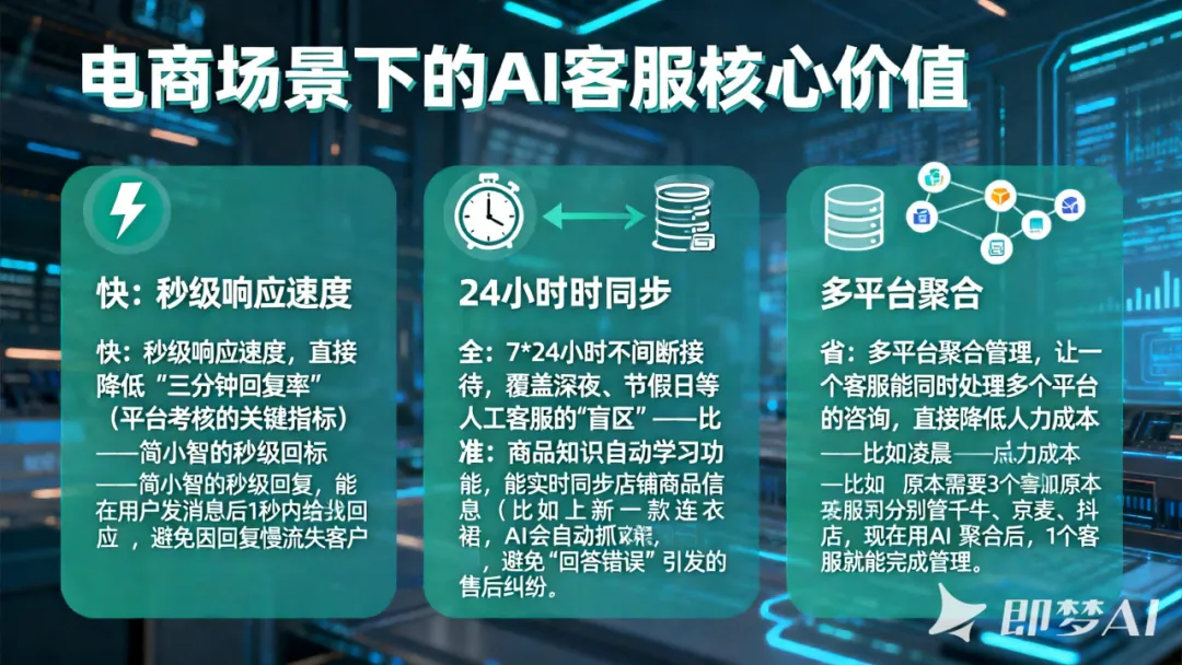 而像简小智这类专注电商场景的AI工具,就是抓住了“商家需要更高效服务”的核心需求, 依靠技术把“AI客