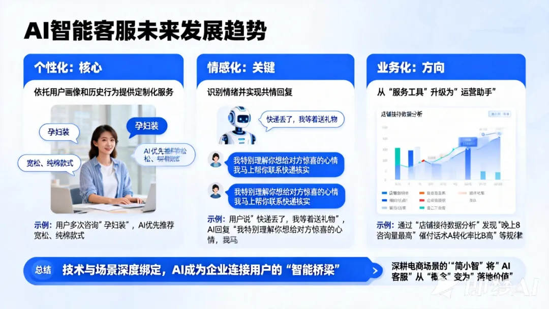 靠着用户画像和历史行为, 个性化是重点,比如说用户多次询问“孕妇装”,AI就会优先给推荐宽松、纯棉的款式;未来的AI不光能识别情绪,还能“感同身受”,情感化是要害,像用户说“快递丢了,我等着送礼物”,AI会回复“我非常能明白你想给对方惊喜的心情, 我立刻帮你联系快递核实”,而不是呆板地说“请提供订单号”;AI会从“服务工具”变成“运营助手”,业务化是方向,比如说通过“店铺接待数据分析”,像简小智的AI回复复盘功能, 帮商家发现“晚上8点咨询量最高”“催付话术A转化率比B高”这类规律, 然后指导商家调整运营策略,个性化是重点。
