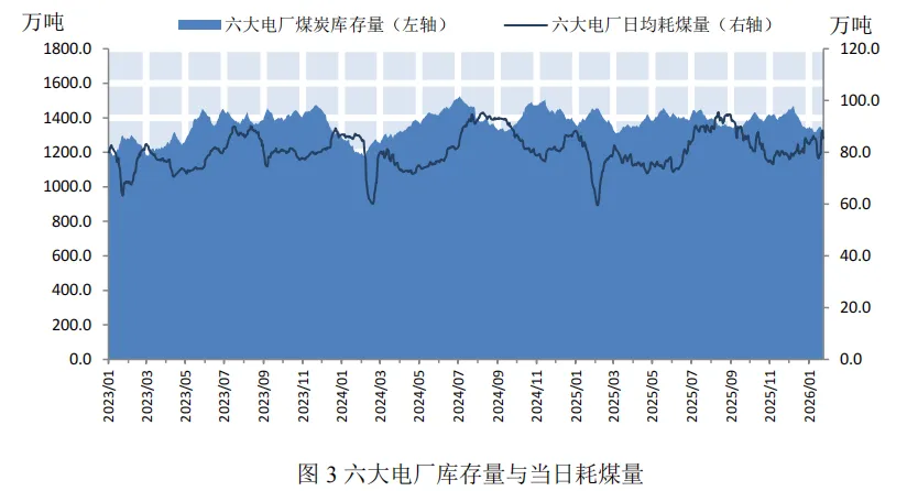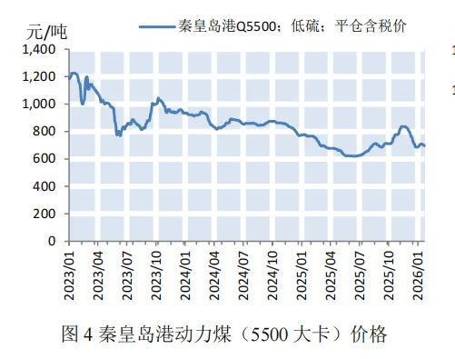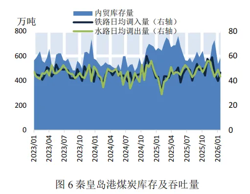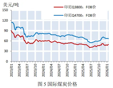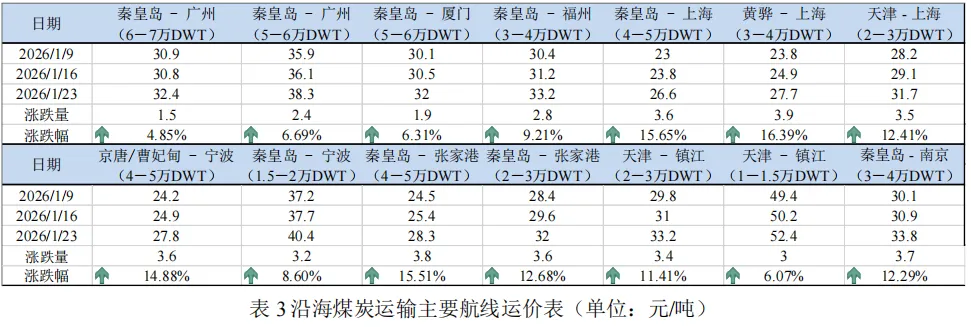 市场综述:沿海散货运价指数微幅上涨,散货船日租金指数大幅上涨上海航运交易所2026年1月23日发布的中国沿海散货运价指数(CBFI)报收于1019.01点,较1月9日上涨0.62%(如图1)。三大货种方面,煤炭、矿石、粮食运价涨跌各现,其中煤炭运价涨幅最大,粮食运价跌幅最大(如表1)。上海航运交易所2026年1月23日发布的中国沿海散货船日租金指数(CDI)报收于1364.2点,较1月9日大幅上涨24.91%(如图2)。各船型租金均呈大幅上涨,其中大灵便型船(4.8万DWT)大幅上涨44.11%至48780元/天(如表2)。截至1月23日,沿海六大电厂的存煤量为1330.7万吨,较上期末小幅上升1.02%;日均耗煤量为85.43万吨,微幅下降0.05%,较上期末基本持平;可用天数维持在15.5天左右,较上期增加0.1天(如图3)。供给:国内煤价小幅下降,国外煤价涨跌各现