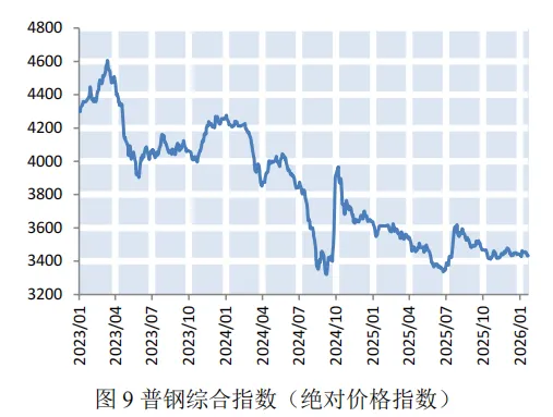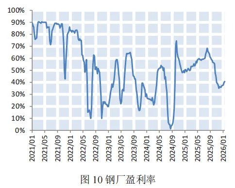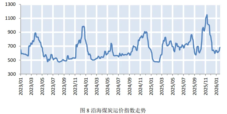 国内煤炭方面,煤价小幅下降。截至1月23日,秦皇岛港Q5500动力煤现货价格报收于696元/吨,较上期小幅下降1.42%(如图4)。进口煤价方面,煤价涨跌各现。截至1月23日,印尼Q3800动力煤FOB价报收于49.5美元/吨,较上期小幅上升5.1%,印尼Q3800动力煤FOB价报收于67美元/吨,较上期微幅下降0.59%(如图5)。本期,北方港口库存小幅上升,铁路调入量大幅上升、水路调出量小幅下降,总体上调入高于调出。本期(2026年1月10日-2026年1月23日)秦皇岛港口煤炭日均铁路调入量为46.59万吨,较上期(2025年12月20日-2026年1月9日)大幅上升17.33%;日均水路调出量43.23万吨,较上期大幅下降11.58%;秦皇岛港内贸煤炭库存为582万吨,较上期小幅上升8.79%(如图6)。本期秦皇岛港锚地平均船舶数量11艘,较上期减少6艘(如图7)。预测:各航线运价均呈上升态势,预计下期运价震荡偏弱运行 本期,全国多地降温明显,居民用电需求增加,下游补库需求释放,加之北方天气影响多港口封航,运力偏紧,沿海煤炭运价大幅攀升。截至1月23日,上海航运交易所发布的沿海煤炭运价指数报收于681.43点,较上期大幅上升11.87%(如图8)。下期,随着春节的临近,停产停工企业陆续增多,工业用电需求同步回落,电厂日耗预计逐步降至季节性低位,后期以消化库存为主。预计下期沿海煤炭运价弱势震荡运行。需求:钢价微幅下降,钢厂盈利率小幅上升