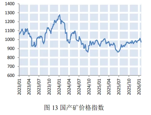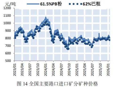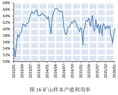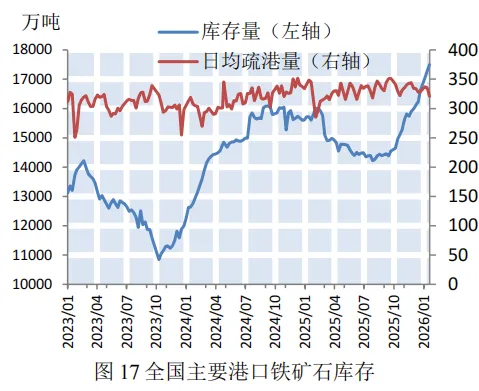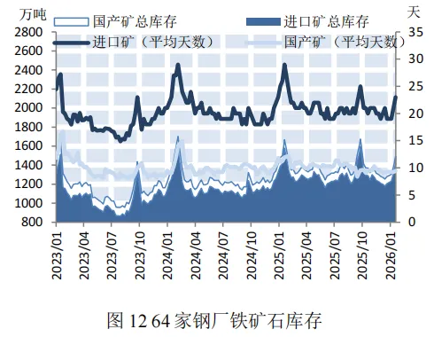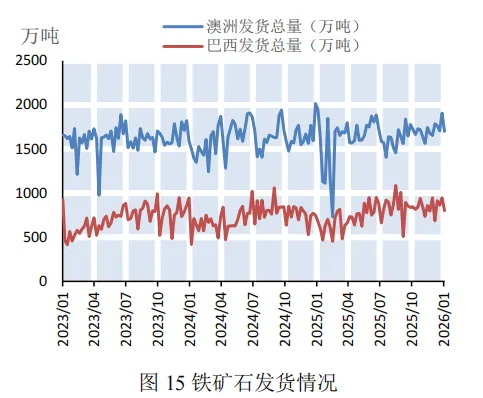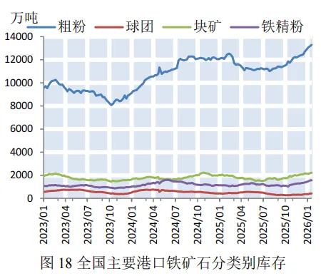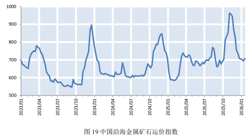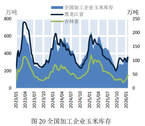 本期,钢材价格微幅下降。截至1月23日,普钢综合指数(绝对价格指数)报收于3434.42点,较上期微幅下降0.51%(如图9)。钢厂盈利率报收于40.69%,较上期小幅上升3.03%(如图10)。本期,钢厂高炉开工率微幅下降。截至1月23日,全国调研的247家钢厂高炉开工率为78.68%,较上期微幅下降0.63%(如图11)。本期,全国64家钢厂进口矿库存和国产矿库存均呈增长态势。截至2026年1月23日,全国调研的64家钢厂进口矿库存1413.14万吨,进口矿平均可用天数23天,较上期增加4天;国产矿库存80.77万吨,国产矿平均可用天数9.51天,较上期增加0.27天(如图12)。国产矿方面,本期国产矿价格小幅下降。截至1月23日,霍邱地区65%造球精粉价格指数报收于973点,较上期下降33点(如图13);进口矿方面,本期进口矿价格小幅下降。截至1月23日,61.5%PB粉报收于809元/吨,较上期下降17.5元/吨;62%巴粗报收于787元/吨,较上期下降13元/吨(如图14)。截至1月23日,澳洲发货总量1440.1万吨,环比下降258.4万吨;巴西发货总量558.6万吨,环比下降244.6万吨(如图15)。截至1月23日,全国186矿山样本产能利用率为60.09%,较上期微幅上涨0.37个百分点(如图16)。港口:港口铁矿石库存小幅上升,日均疏港量均小幅下降本期,全国主要港口铁矿石库存小幅上升,日均疏港量小幅下降。截至1月23日,全国主要港口铁矿石库存17496.53万吨,较上期增加452.09万吨,日均疏港量320.52万吨,较上期小幅下降4.88%(如图17)。按品种分类,粗粉库存13292.17吨,较上期增加218.67万吨;球团库存418.14万吨,较上期增加58.35万吨;块矿库存2216.9万吨,较上期增加88.52万吨;铁精粉库存1569.32万吨,较上期增加86.55万吨(如图18)。预测:铁矿石运价微幅上升,预计下期运价维持弱势运行本期,港口铁矿石库存持续增长,下游钢材生产维持低位,但受天气影响,即期运力供应偏紧,沿海金属矿石运价微幅上升。截至1月23日,上海航交所发布的中国沿海金属矿石运价指数报收于708.08点,较上期微幅上升0.88%(如图19)。各航线运价呈上升态势,其中青岛/日照-张家港(2-3万DWT)航线运价小幅上升2.21%至27.7元/吨(如表4)。下期,临近春节,大部分矿企将陆续停产,钢企也因利润以及库存压力等原因均有主动减产检修及放假计划,预计下期各航线运价维持弱势运行。供需:加工企业玉米库存小幅上升,北方港口玉米价格小幅上涨