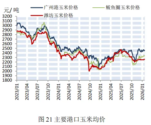 本期,加工企业玉米库存小幅上升。截至1月23日,全国加工企业玉米库存383.8万吨,较上期小幅上升29.8万吨(如图20)。本期北方玉米市场价格小幅上涨。截至1月23日,广州港玉米价格为2450元/吨,较上期(1月9日)持平,鲅鱼圈玉米价格为2340元/吨,较上期增长30元/吨,潍坊玉米价格为2260元/吨,较上期增长10元/吨(如图21)。港口:北方港口下海量小幅下降,南方港口内贸库存持平