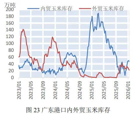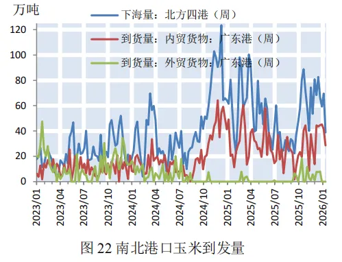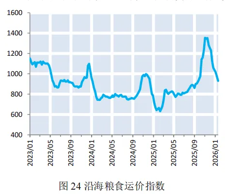 本期,北方港口下海量小幅下降,南方港口内贸库存持平。本期(2026年1月10日—2026年1月23日)北方四港玉米下海量共计108.4万吨,较上期(2025年12月20日—2026年1月9日)下降17.6万吨;广东港口内贸玉米到货量为70.1万吨,较上期下降19.8万吨;外贸玉米到货量为0万吨,较上期下降8.1万吨(如图22)。截至1月23日,广东港口内贸玉米库存47.8万吨,较上期持平;外贸玉米库存21.9万吨,较上期下降7.5万吨(如图23)。预测:沿海运价持续下跌,预计下期继续维持弱势下滑走势本期,种植户售粮意愿增强,叠加政策性粮源不断投放,市场粮源充足,但终端收购动力相对不足,沿海粮食运价小幅下跌。截至1月23日,上海航交所发布的沿海粮食运价指数报收于931.12点,较上期下降6.1%(如图24)。各航线运价均呈下降态势,其中大连/锦州-广州(5-6万DWT)运价下降12.76%至46.5元/吨(如表5)。下期,深加工以及饲料企业库存整体呈现增加态势,下游深加工及饲料厂年前备货或将完成,预计下期沿海粮食运价延续弱势下滑走势。