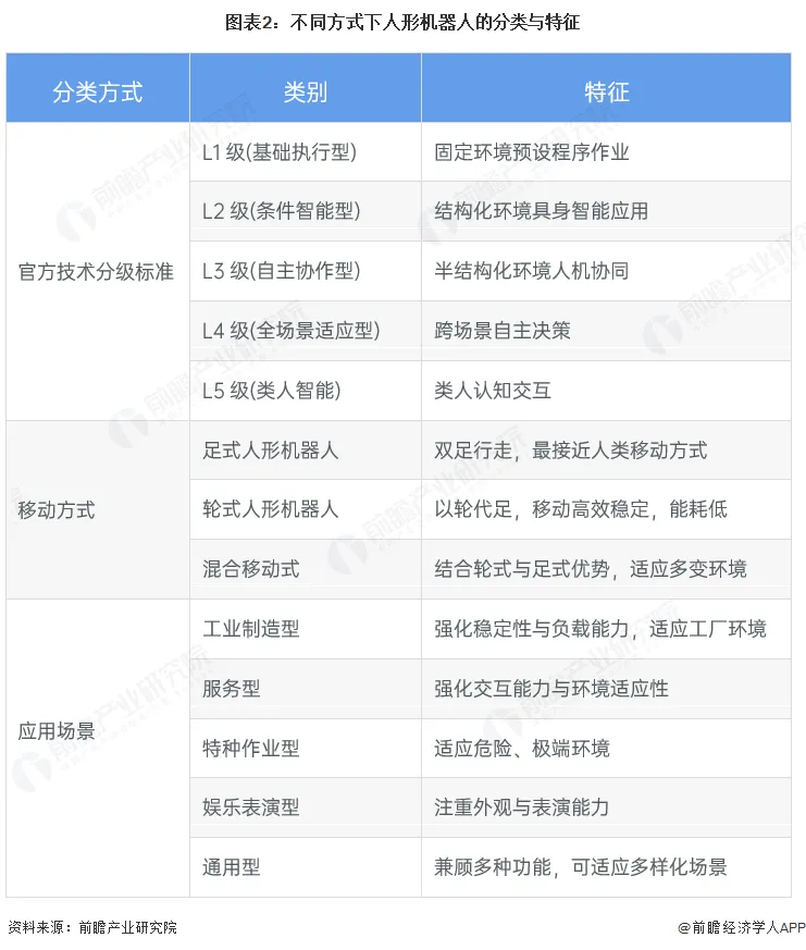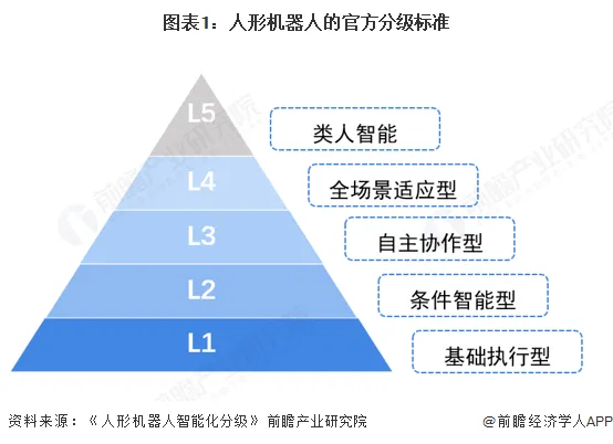 机器人是融合感知、决策与执行能力的可编程自动化实体系统,能在其环境中自主或半自主地完成预定任务,而人形机器人就是仿照人类特征设计的一类智能机器人,具备类人运动与交互能力。按照官方技术分级标准《人形机器人分类分级应用指南》,人形机器人可分为四个等级,基础执行型(L1级)、条件智能型(L2级)、自主协作型(L3)、全场景适应型(L4),北京人形机器人创新中心《人形机器人智能化分级》新增了类人智能(L5级);除此之外,按照人形机器人的移动方式还可将其分为涵盖双足式、轮式及混合移动式人形机器人;按照应用场景,可分为工业制造型、服务型、特种作业型、娱乐展示型及通用型人形机器人。