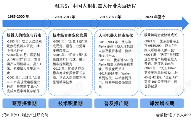 1985-2000年萌芽探索期,以哈工大启动研发、国防科大“先行者”和北理工“汇童BHR-1”问世为标志,实现双足行走等基础技术突破;2001-2012年技术积累期,完成多传感器融合、复杂动作控制等系统集成,优必选成立开启商业化探索;2013-2022年稳健发展期,优必选Alpha系列、Walker系列迭代落地,核心零部件国产化率提升至50%以上,产业生态初步形成;2023年至今爆发增长期,优必选上市、“天工”“远征A2”等产品创下多项世界纪录,实现千台级量产与多场景规模化应用,核心零部件国产化率超90%,市场规模快速扩张,行业从技术验证迈向规模应用。