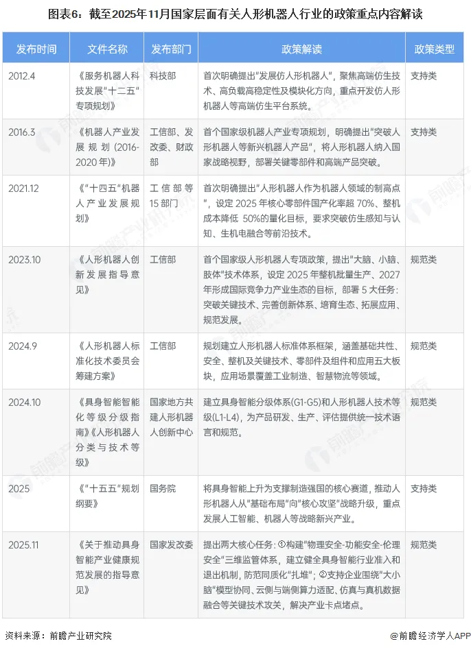 2012年以来,我国人形机器人行业政策体系持续健全完善,以“技术突破、生态培育、场景推广”为核心导向,从战略顶层设计到专项实施细则层层递进——既聚焦核心技术研发攻坚,为行业筑牢创新根基;又着力构建标准体系、强化安全监管,精准填补行业发展的规则空白,全方位推动人形机器人行业从技术萌芽阶段稳步迈向规模化落地、规范化发展的全新阶段。工信部于2023年10月20日正式发布的《人形机器人创新发展指导意见》,是我国首个国家级、系统性人形机器人行业政策,明确了人形机器人战略定位与发展目标,聚焦核心零部件自主可控、AI 融合及标准体系构建,推进多场景应用并配套保障机制,引领行业高质量发展。