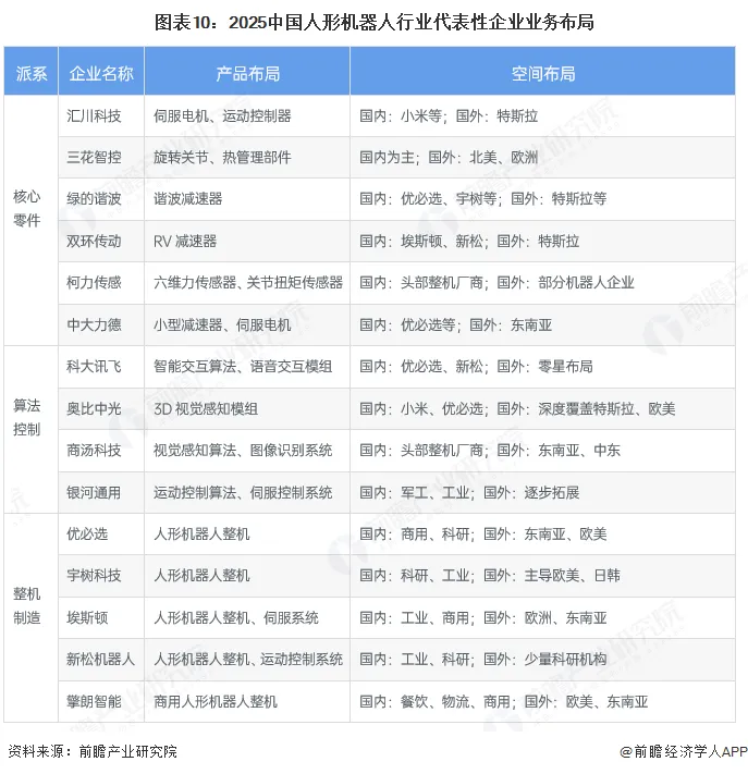 从企业产品布局与空间布局来看,核心零件派聚焦伺服电机、减速器等关键部件的研发与供应,深度绑定国内外头部整机厂供应链,形成稳定配套合作关系;算法控制派以AI技术为核心,主攻交互智能、视觉感知等核心技术研发,部分企业凭借成熟技术实力深度覆盖欧美整机厂商,海外市场渗透率突出;整机制造派产品分布国内外市场,适配工业制造、商用服务、学术科研等多元化场景。