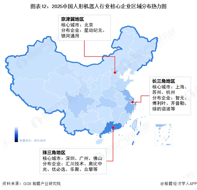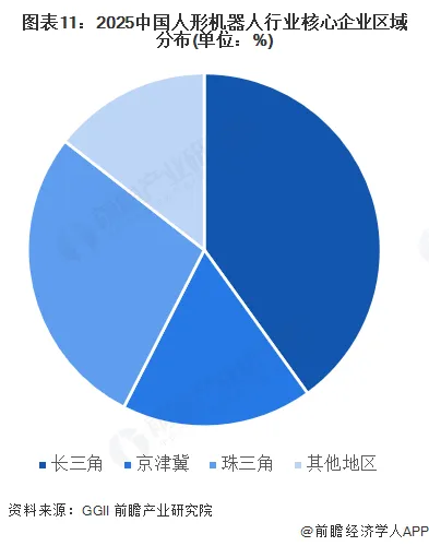 从各个区域的企业分布情况来看,长三角以沪杭苏为中心形成覆盖21个城市的完整产业链网络,上海集聚近半数整机企业,江苏、浙江在减速器、电机、AI大模型等领域各有突破;珠三角以深圳为核心,其企业分布数量全国排名第一,在珠三角区域企业数量占比约80%,构建起全产业链生态;北京是京津冀地区的绝对核心,分布企业数量占区域的90%左右,整个区域以传统产业配套为主。三个区域由于产业资源、配套设施及市场需求差异,技术成果多流向长三角及珠三角地区。