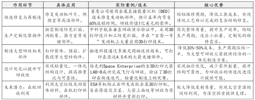 在轨3D打印目前主要探索利用太空环境适配材料,打印航天器零部件、维修工具及应急补给物资,减少地面发射补给的成本与风险。