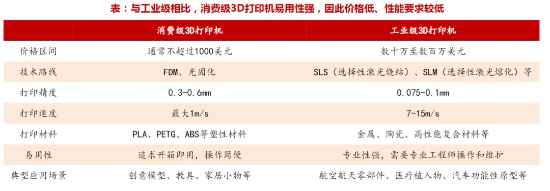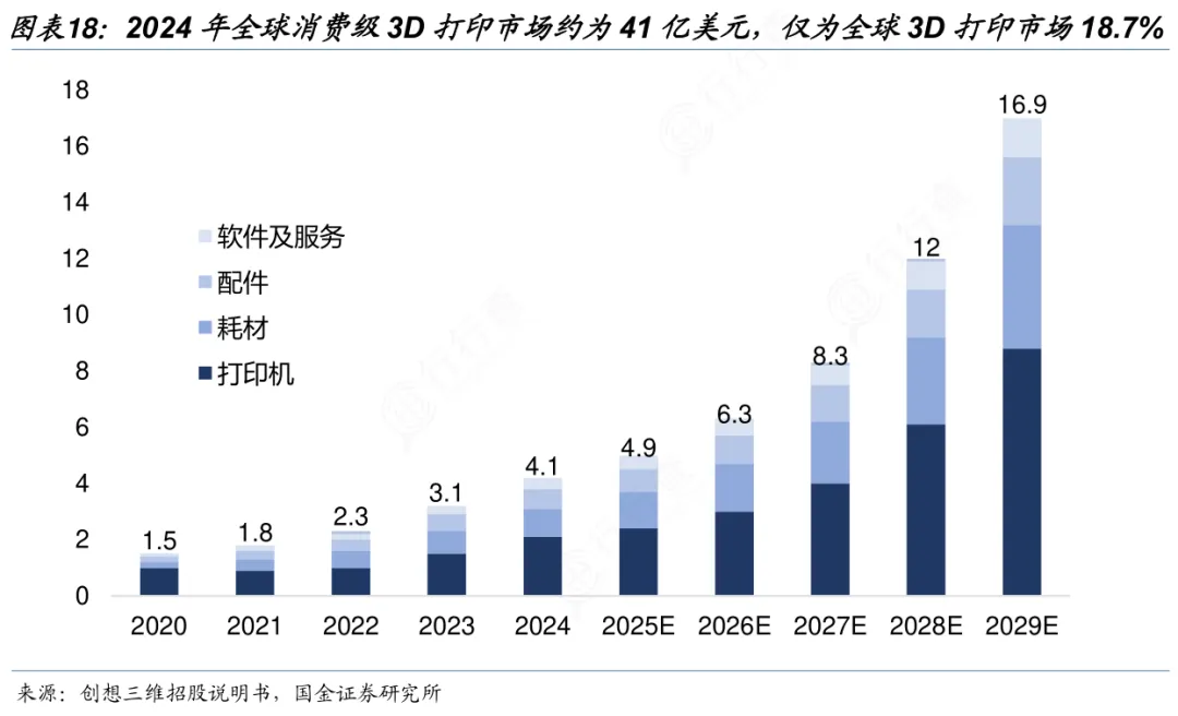 根据创想三维招股说明书,2024年全球消费级3D打印市场约为41亿美元,约占全球3D打印市场219亿美元的18.7%,预计2025年将达到49亿美元。据此可见,工业级3D打印目前仍占市场主导。
