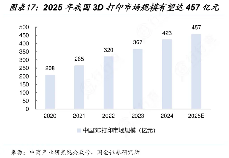中商产业研究院的数据,2024年中国3D打印市场规模约为423亿元,约占全球市场的27%,预计2025年市场规模将突破450亿元。