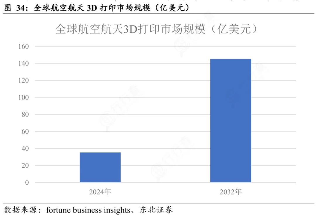 Fortune Business Insights数据显示,2024年全球航空航天领域3D打印市场规模约为35.3亿美元,预计2032年可以达到145.3亿美元,2025~2032年复合增速超过20%,行业处于快速成长期。