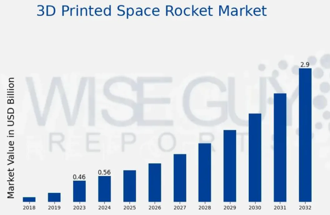 根据wiseguyreports数据,全球3D打印太空火箭市场预计将出现大幅增长。2024年这一市场约为5.6亿美元,到2032年预计将达到约29亿美元,年均复合年增长率预计将达到22.84%。