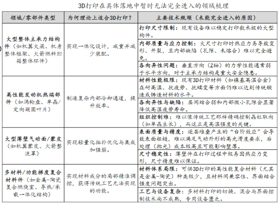 材料制约是规模化应用的关键:适配航天极端环境的专用打印材料种类有限、研发滞后,且高性能核心耗材制备工艺复杂、成本偏高,增加技术落地压力。