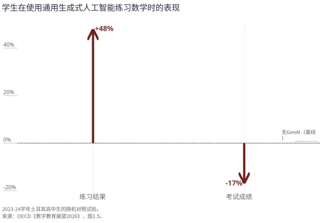 该报告研究发现,学生使用通用人工智能工具后,可以提高任务表现,却不能获得真正的学习收益。数据显示,学生使用人工智能完成数学作业之后,完成效果提升了48%,但测验成绩下降了17%。将认知任务交给通用聊天机器人,会带来元认知惰性,长期可能阻碍技能习得。相比之下,为明确的教学目的而设计或使用的教育专用生成式人工智能工具,往往能显示出对学习的持续促进。