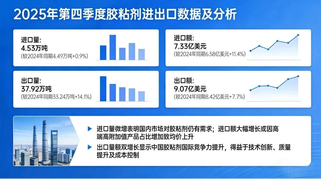 2025年第四季度(10 - 12月份),胶粘剂进口量为4.53万吨,较2024年同期的4.49万吨增长0.9%;进口额为7.33亿美元,较2024年同期的6.58亿美元增长11.4%。进口量的微增表明国内市场对胶粘剂仍存在一定的需求,而进口额的大幅增长则可能是由于进口产品结构的优化,高端、高附加值的胶粘剂产品占比增加,导致平均进口价格上升。