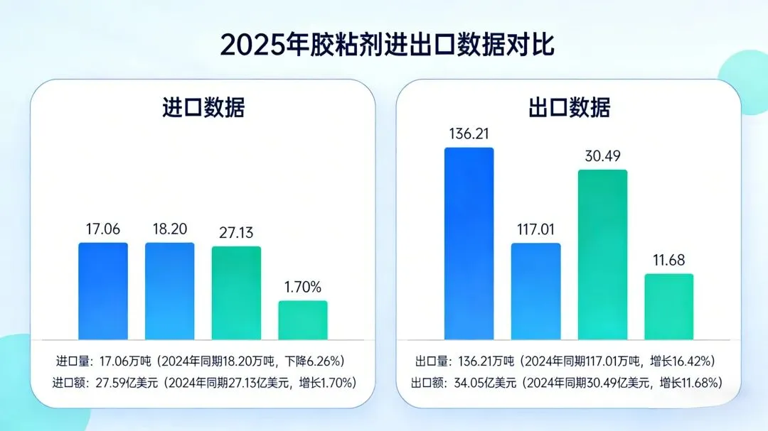 出口方面,胶粘剂出口量为37.92万吨,较2024年同期的33.24万吨增长14.1%;出口额为9.07亿美元,较2024年同期的8.42亿美元增长7.7%。出口量和出口额的双增长显示出我国胶粘剂产品在国际市场上的竞争力不断提升,市场需求持续扩大。这得益于我国胶粘剂行业在技术创新、产品质量提升以及成本控制等方面的不断努力,使得产品能够更好地满足国际客户的需求。