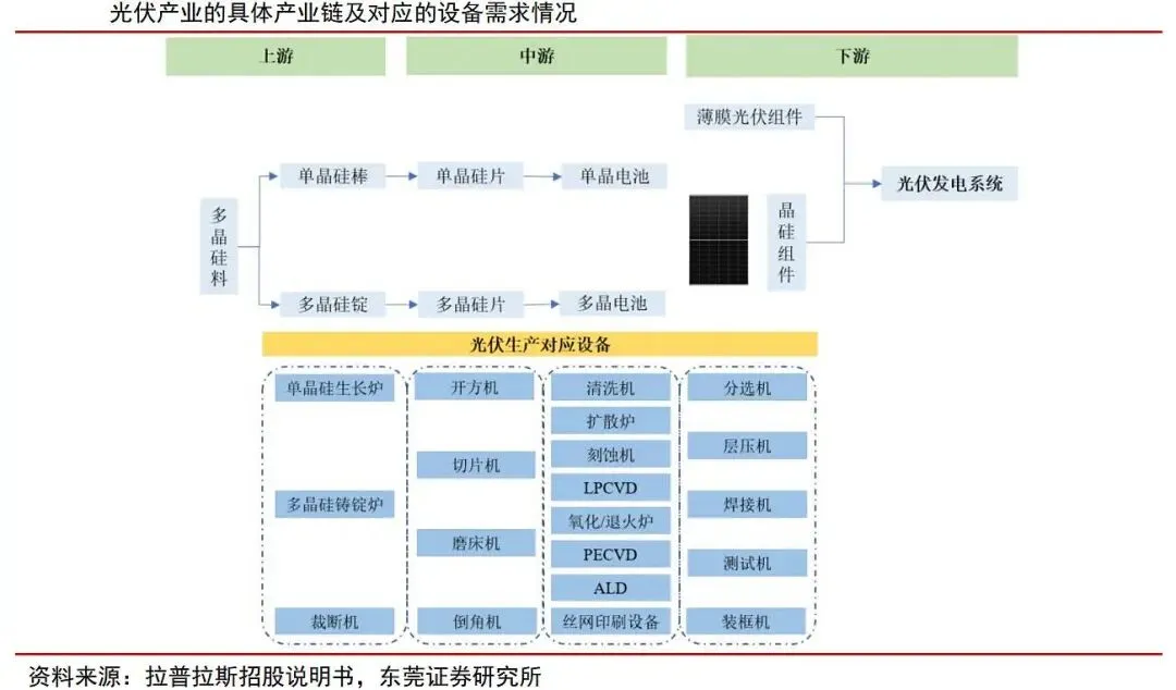 光伏制造产业链按生产环节可划分为硅片设备、电池片设备和组件设备三大类。其中,硅片设备主要包括单晶炉、切片机等;电池片设备涵盖清洗制绒、扩散、刻蚀、镀膜及丝网印刷等关键设备;组件设备则主要包括焊接机、层压机、测试机等。