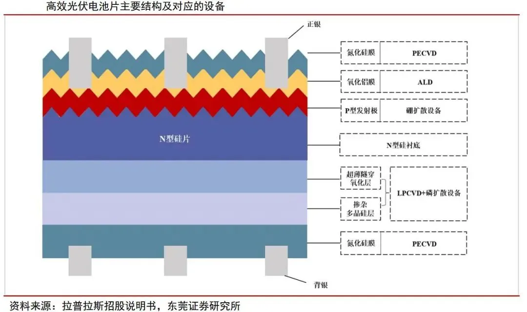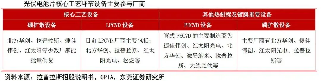 拉普拉斯:专注于高效电池片制造所需的高性能热制程与镀膜设备,主要产品包括硼扩散、磷扩散、氧化退火等热制程设备,以及LPCVD、PECVD等镀膜设备。其中,硼扩散设备与LPCVD设备是当前高效电池新增核心工艺的关键装备。