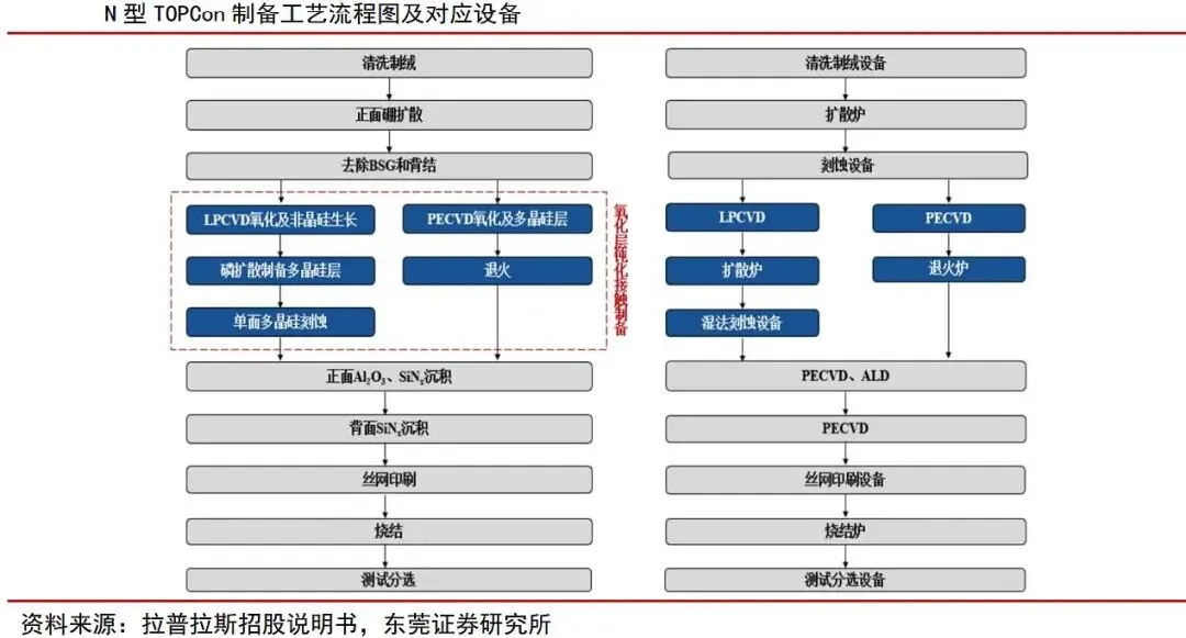 除上述关键环节外,TOPCon其他生产设备与PERC产线大体兼容,主要包括清洗制绒、刻蚀、正面氧化铝沉积、双面氮化硅沉积及丝网印刷等工序。此外,XBC电池的制造流程与PERC差异较大,但同样需要使用LPCVD制备隧穿氧化层和掺杂多晶硅层;若为N型XBC,则还需使用硼扩散设备进行掺杂。
