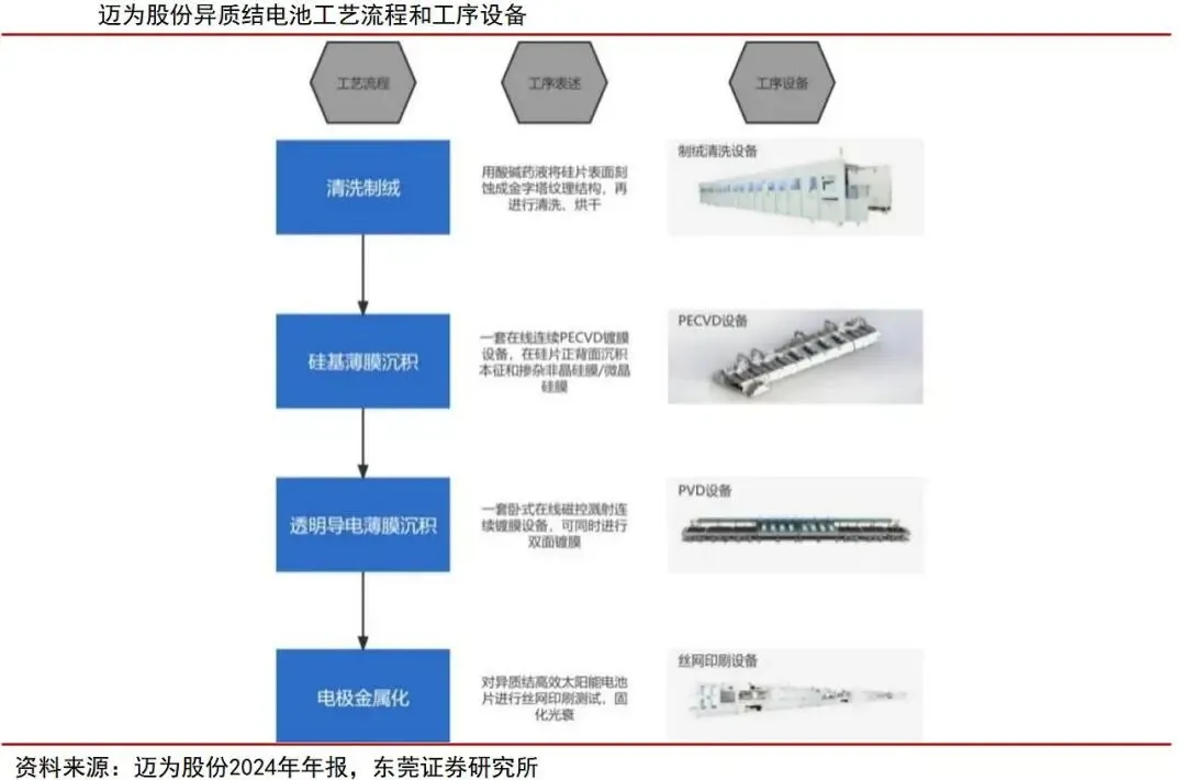 在设备方面,迈为股份在原有丝网印刷技术基础上,通过自主研发先后攻克了HJT电池核心工艺中的非晶硅薄膜沉积(PECVD设备)与TCO膜沉积(PVD设备),并借助参股公司引入日本YAC的制绒清洗技术,从而形成了HJT电池整线设备供应能力。目前,其HJT整线设备已成功实现海外销售。